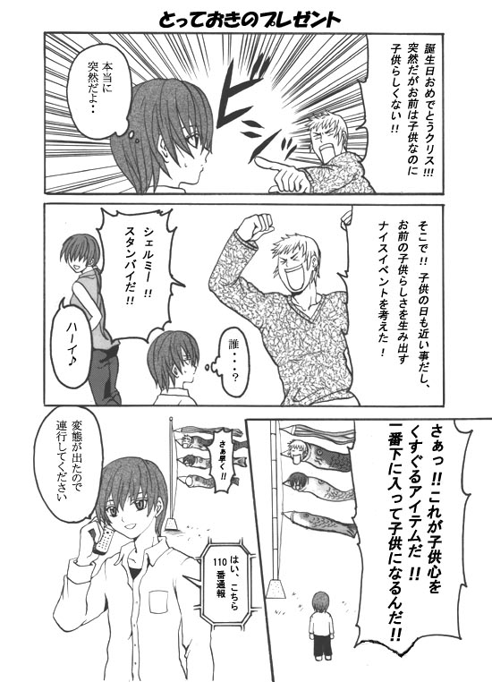 クリスの誕生日漫画’05バージョンです。今年は季節ネタも絡めて みましたが、いつもにも増して社とシェルミーが壊れていてクリスがドライですね; すいません・・・;;決して悪意はありません!全て愛です!! 戻る(「マンガ&ミニ絵」コーナーへ) 戻る(「同人活動情報」コーナーへ)