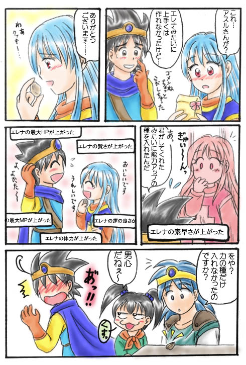 マイ設定キャラたちです。種入りお菓子ネタを引っ張ってみました(笑) アスルは、本を見ながらならなんとか料理もできるようです。 このネタを弟に見せたら「アスルにシンクロしただろう」と 言われました…。はい、すみません。わたしも 僧侶ちゃんに力の種は使いません(爆) 戻る