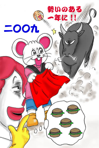 2009年 年賀絵・イロモノ版 干支の牛と、某mのドナ様、鷲羽山ハイランドの チューピー君、そしてマスコットのマルノです。 チューピー君は闘牛をして遊んでます。 ドナ様は立派な牛を見て…(以下削除) 戻る