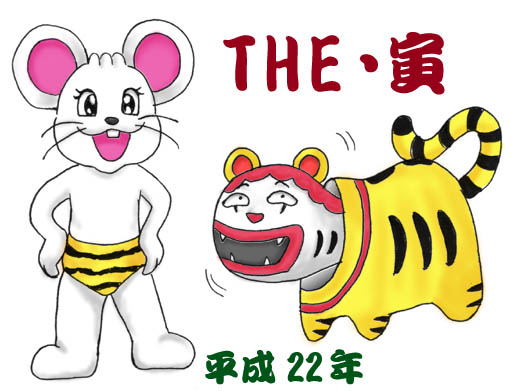 2010年年賀絵・イロモノ版 寅年ということで……鷲羽山ハイランドのマスコット・ チューピー君にはトラ柄のパンツをはいて頂き、某mの 看板ピエロ・ドナルドには張り子のトラになって頂きました(爆) なんというトラップ