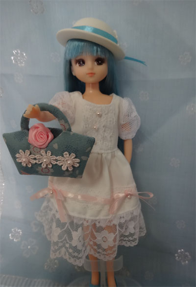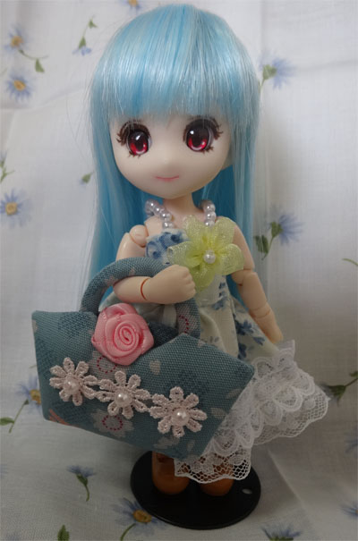 水色ベースの花模様に可愛いピンクのバラやパールビーズ…