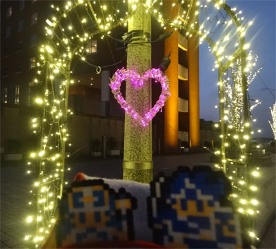 あちこちに光り輝くハートのオブジェがあり、恋人たちの