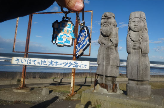オホーツク海をバックに。