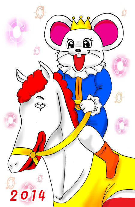 2014年年賀絵・イロモノ版 白馬に乗った王子様に扮した、鷲羽山ハイランドのチューピー君です。 おや、良く見ると白馬が…!?すみません、某mのドナ様に馬化して 頂きました(爆)顔が白いから白馬にはぴったりですよね(何) チューピー君は今年で20才DEチュ〜