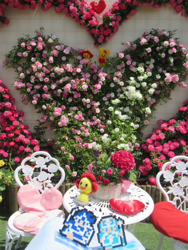 バラがハートの形に植えられた素敵なフォトスポット!マスコットの「ピロロ」と「ポロロ」も可愛いですv