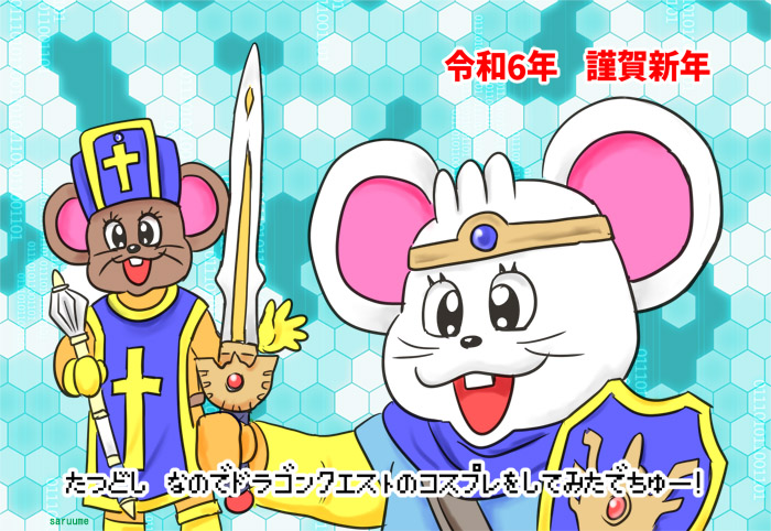 2024年 年賀イラスト・鷲羽山ハイランド版 2024年は辰年、ドラゴンの年!というわけで、チューピーとチューリーにも ドラクエコスプレしてもらいました。二匹はDQの世界に行けばどう考えても遊び人か 踊り子だと思いますが(笑)3の勇者&僧侶のコスなのはわたしのシュミです(爆)
