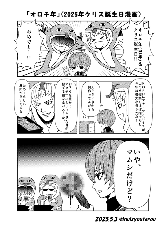 クリス誕生日漫画2025年版です。今年は巳年(オロチ年)ということで、蛇の着ぐるみ(?)を 着て祝う社とシェルミーです。某通販サイトで見つけた蛇の着ぐるみをアレンジしました。最後はちょっと グロくなってしまいましたね…調べてみたところ、実際にマムシを蒲焼きにして食べたという食レポも いくつか見かけましたが、ちょっと試す気にはなりませんでした。 オロチ年に蛇を蒲焼きにするクリスの心情は謎と言うことにしておきましょう。 戻る