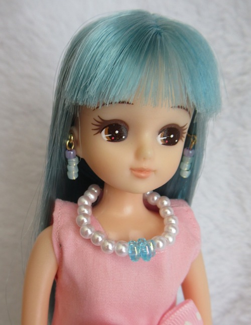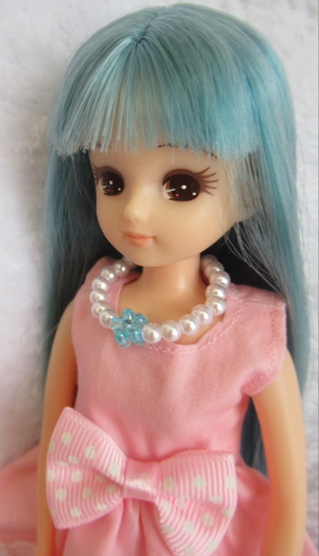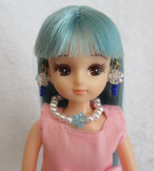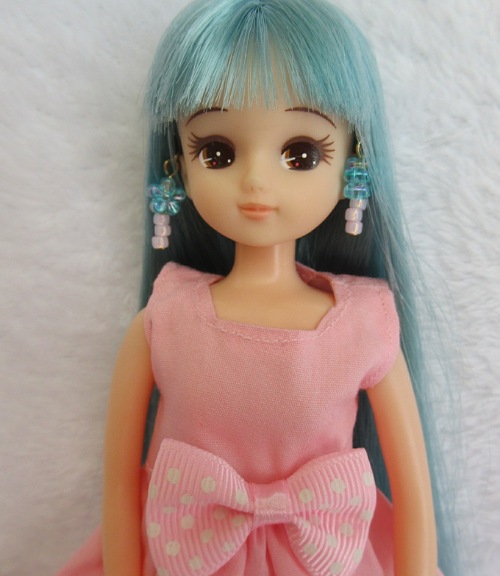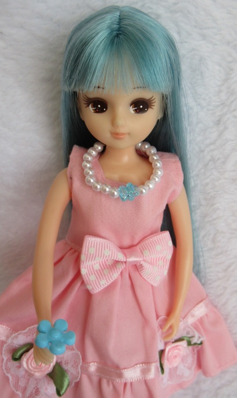 髪とお揃いの水色の花飾りにきらめく白いビーズ。清楚さを引き立ててくれますね♪