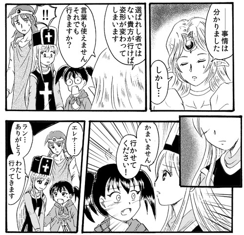 内容サンプル。今回は「DQ3本」というよりは「シアトリズムDQ本」ですが、 「勇僧本」であることは間違いありません。1Pショート形式で話が進みます。 他のナンバリングタイトルからも、少しだけですが何名か出演します。 9の「ナイン」は、マイ設定の9主人公・エリオになってますがね。 戻る