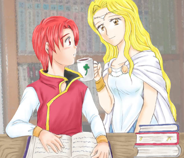 ココアの甘い匂いに気付いてアゼルは顔を上げた。 「あ…エーディン…!」 「アゼル、随分長い間勉強しているでしょう?一生懸命なのはあなたの いいところだけど、無理をしてはいけません。ね、少し休んで」 「う、うん…ありがとう…でも、もう少し頑張るよ。だって…」 「え?なぁに?」 「ううん、なんでもない!」 ―――だって…君を守る為に強くなりたいから…――― …とまぁ、こういうシチュエーションだと思ってください(笑)