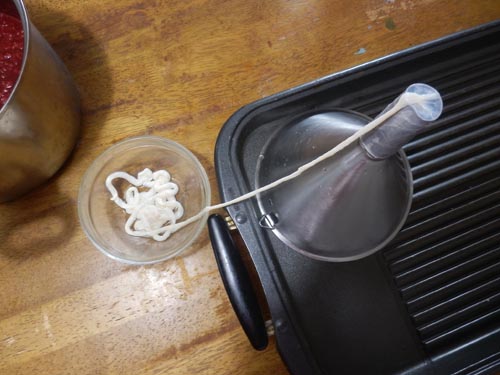 漏斗にセットして、逆の先端はくくっておきます。DVDではでっかいバットの上でやって