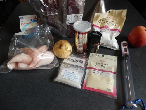 材料は豚の血、豚の背油、玉ねぎ、生クリーム、天然ケーシング(豚の腸)、コーンスターチ、キャトル・エピス