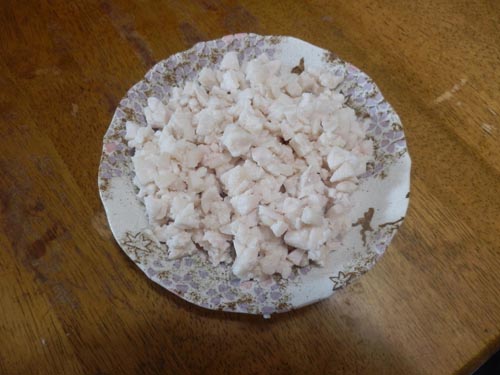 まずは背脂200gを刻みます。ベトベトして上手く切れません。