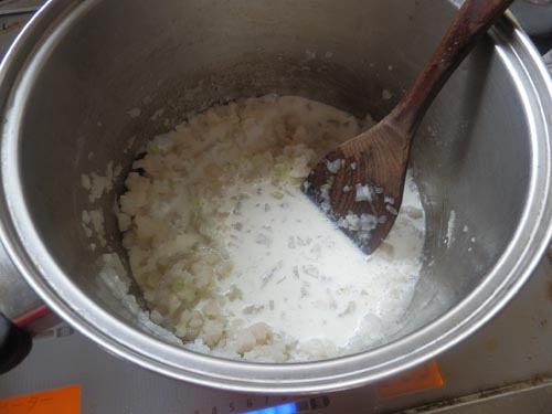 入れて玉ねぎは透明になるまで炒めます。そこに生クリーム250cc投入して煮込みます。
