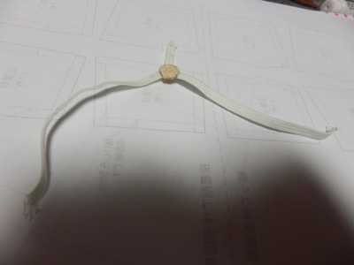 ゴム紐を使って作りました。中心の部分は白い革のはぎれ。