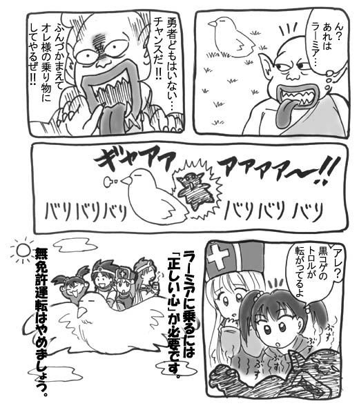 DQ3で交通安全(?) 交通安全週間に合わせ、DQ3版の交通安全呼びかけマンガを描いてみました(笑) ラーミアって心正しき者にしか乗れないんですよね。はい、無免許運転はダメですよ〜。
