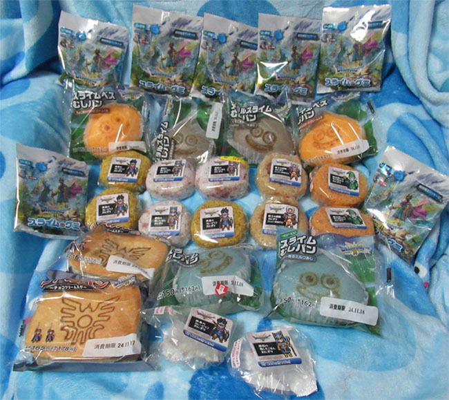 帰宅後、買ったものを並べて記念撮影〜!(1つずつ食べた勇者と僧侶のおにぎりはパッケージのみになっています(笑))