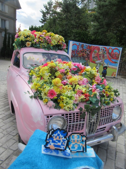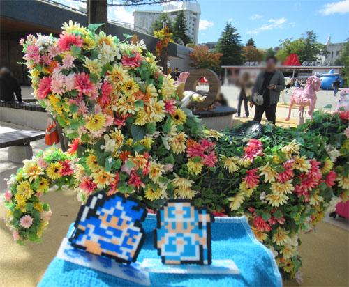 かつてメリーゴーランドに使われていた馬が花で飾られていました。
