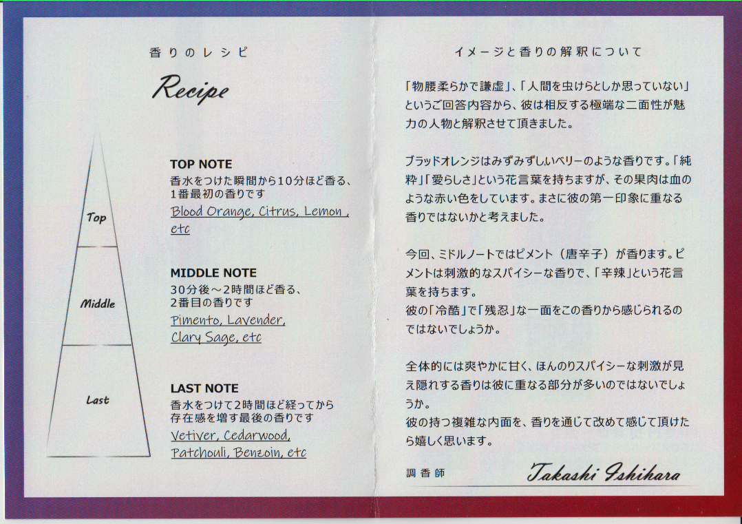 販売されているそのキャラをイメージした香水です!KOFでも庵とか出ていたはずです。