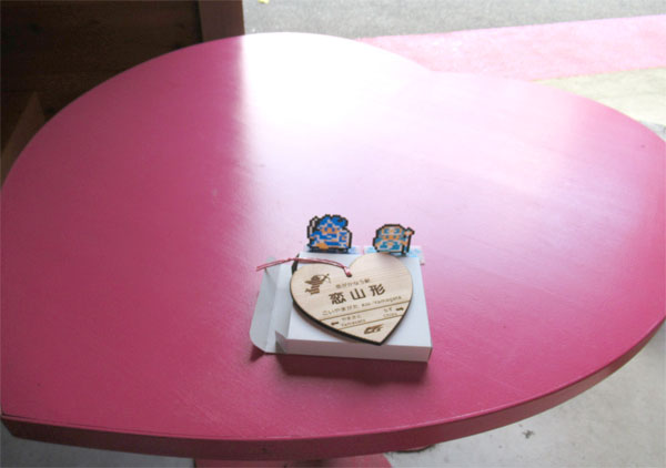 ハート型のテーブルで、絵馬に願いを記入。
