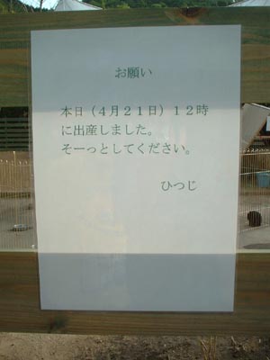 おめでとうございます。 「ニューレオマワールド」にて。 動物とふれあえる場所があり、そこの柵に貼られていた張り紙です。 いやもう、ひつじから直接「そーっとしてください」なんて お願いされちゃ従うしかないでしょう!(笑) そーっと通り過ぎました。