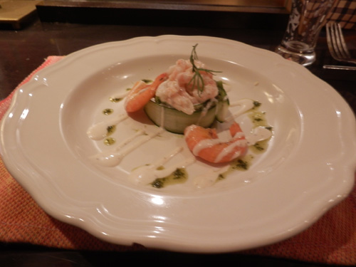 前菜。アボカドのムースグリーンランド産小エビ飾り。