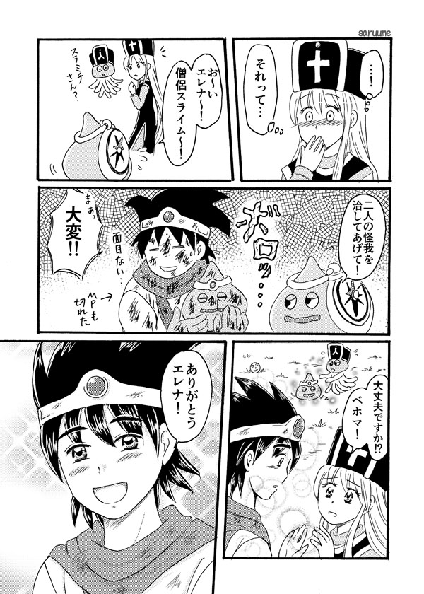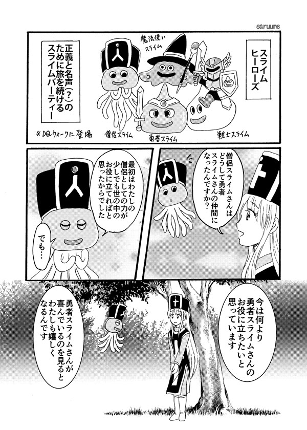 DQウォークの期間限定イベントに登場した「スライムヒーローズ」がお気に入りで、 マイパーティーと絡めた話を描きたいと思っていたのです。 (ウォークはマイパーティーでやってます) もちろん(?)勇者スライム×僧侶スライムを推しています!(笑) 僧侶スライムのセリフに勇者スライムを気にかけてるのを感じられるものもあり、萌えてましたね。 スラミチにも全快させる力はありますが、「スラミチに頼む」も使い切った後ということで…。