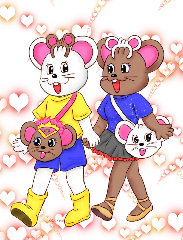 リア充ネズミのデートコーデ 当サイト25周年記念企画の一環で描いたものです。鷲羽山ハイランドで実際に販売している カチューシャとフェイスポーチを身に着けてデートするチューピーとチューリーです。 (ちなみにカチューシャはリバーシブルです)お互いに愛しい相手のものを使ってラブラブ全開!