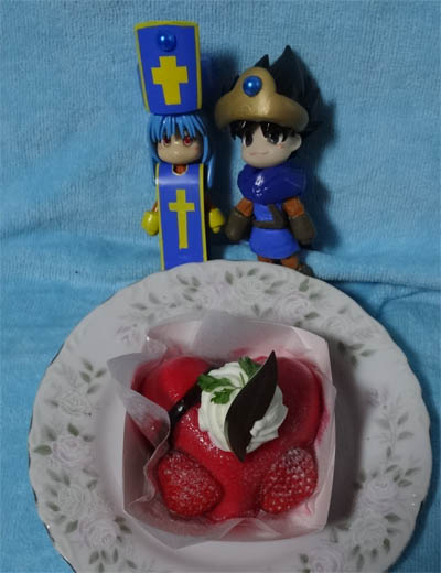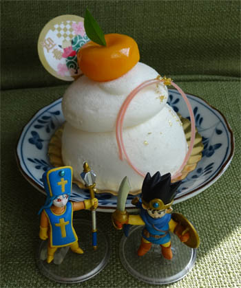 お正月に近場のケーキ屋で発見した鏡モチ型ケーキと共に。