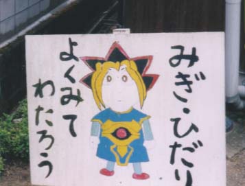 いや、そんなに見つめられても…。 またしても手作り感漂う交通安全標識の登場です。 わたし遊●王には詳しくないですけど… これはさすがにちょっと(以下自粛) みなさん、交通安全に努めてくださいね♪ (と、キレイにまとめてごまかして立ち去る)