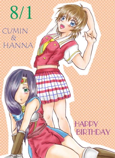 2003年8月1日トップ絵 今回もやりました、合作お祝い! また下絵を小太郎が描き、うめ吉が色塗りをしています。 なんだかクミンがエロくさいですね…(汗笑) 背景はハンナもクミンもうめ吉が描いています。 戻る