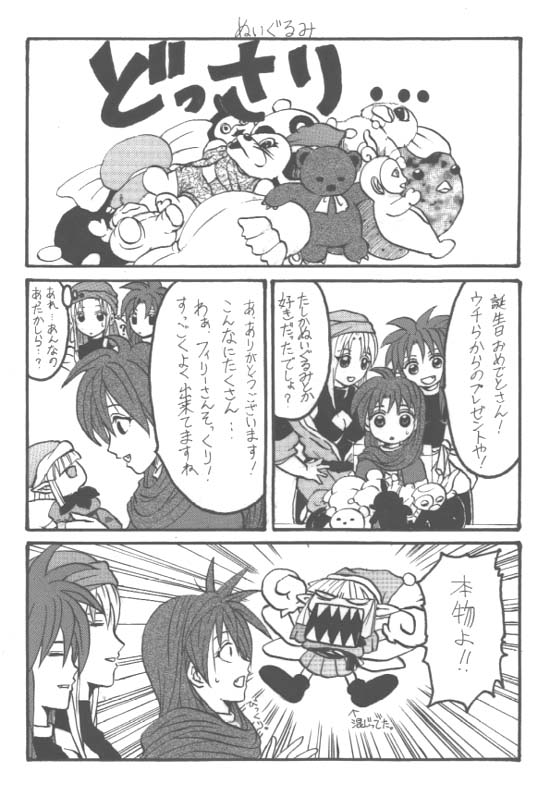 よく話が分かりませんが、とりあえず誕生日漫画が描きたくて描きました; パーティーがカレンとアルザなのは今回の同人誌のパーティーだからです。 って事で新刊に収録します。・・・あとぬいぐるみの中に変なものが 混じっていることは気にしないでください(笑) 戻る