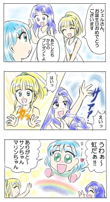 当サイト看板娘のシェルの誕生日という設定の、7月16日に日記に掲載しました。 全部パソコンで描きました。枠線と着色と文字がフォトショップで、線画がSAIです。 光の精霊サンシャインと水の精霊アクアマリンによる、お互いの 属性を生かしたプレゼントでした〜。シェルはサンシャインを 「サンちゃん」、アクアマリンを「マリンちゃん」と呼んでいます(笑)