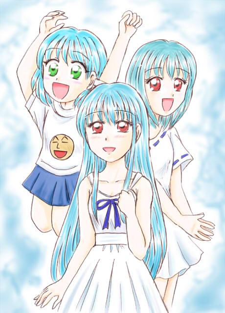 2009年版・残暑見舞い 左から、シェル・エレナ・アルナです。 アルナが着ているのはゲーム中にもある「サマードレス」のつもりです。 そしてマルノがピョン吉状態に…(笑)ど根性マルノ(謎)