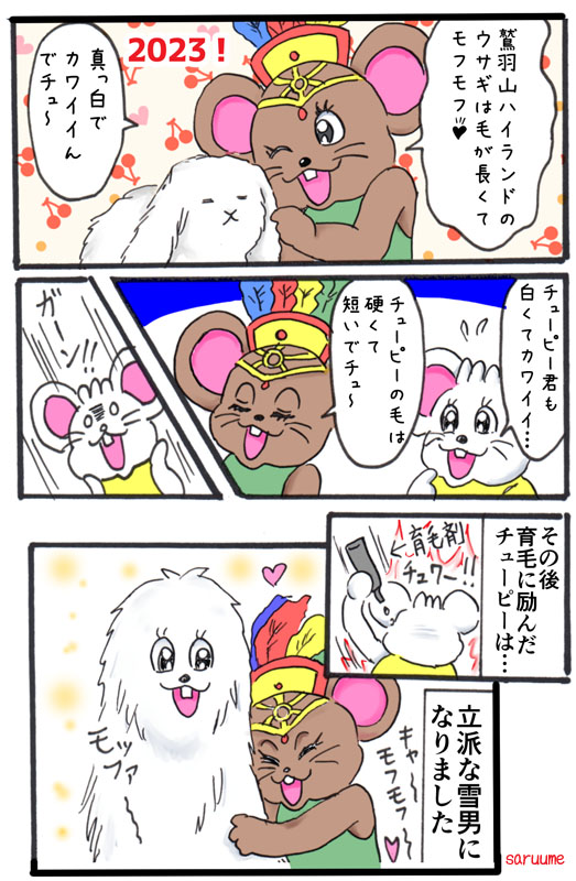 うめ吉の年賀マンガ2023・鷲羽山ハイランド版 2023年はウサギ年なのでウサギネタです。 鷲羽山ハイランドのふれあいコーナーにはモフモフの白ウサギがいます。 今年も鷲羽山ハイランドのますますの発展を願っています! 戻る