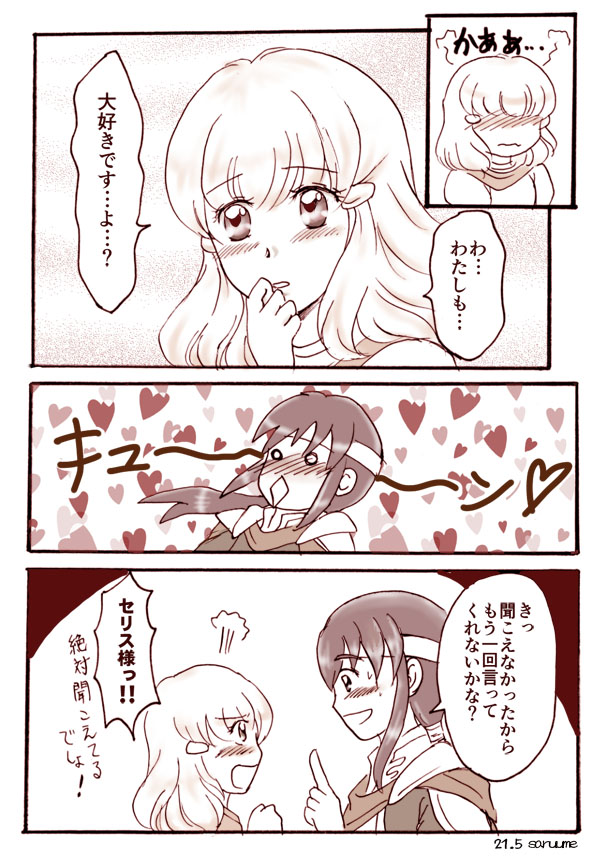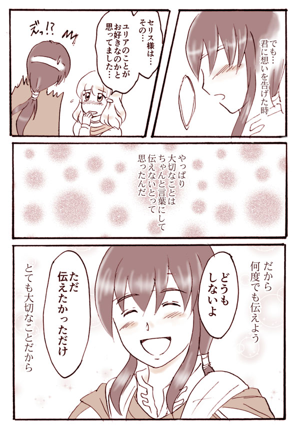 伝えたい大切なこと FE聖戦が25周年ということで、お祝いに描いたセリス×ラナ漫画です。 セリラナはすれ違いやら複雑な想いやらいろいろ乗り越えて、結ばれた後は いつまでも仲睦まじく微笑ましいカップルであり続けることでしょう♪ 25周年おめでとうございます!!