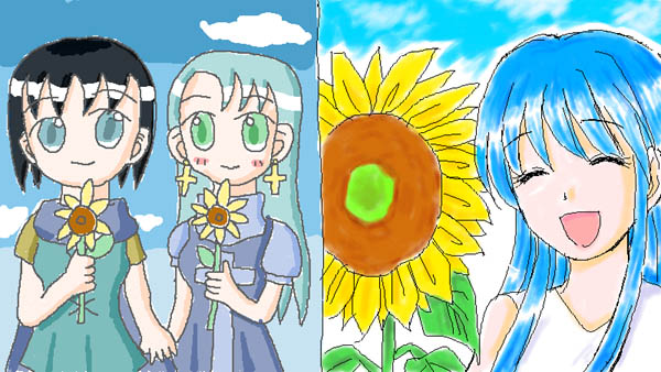 エレナを描いてみました。空飛び猫さんもそれに合わせて、ヒマワリを持ったアリアちゃんとカノンちゃんを