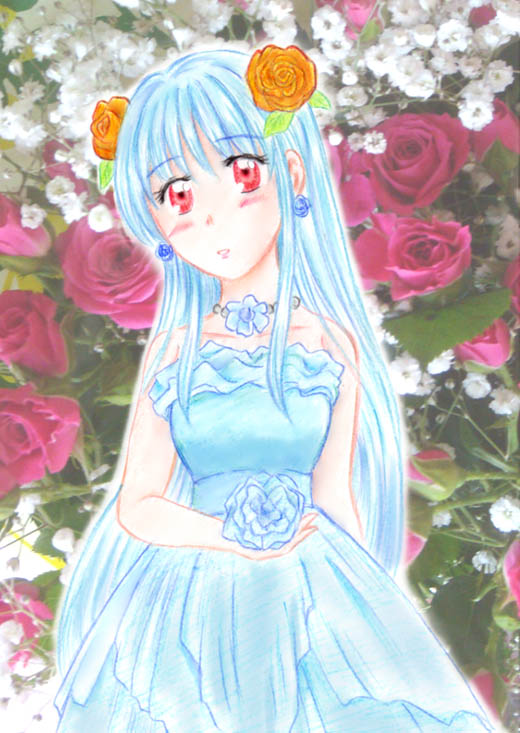 ドレスも薔薇も髪も青系じゃちょっと味気ないかなと思って、黄色に塗り直しました。