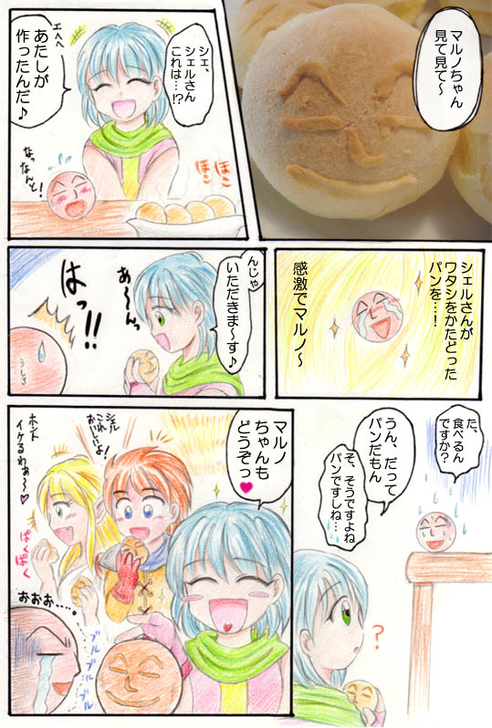 マルノ型パンを作ったので、その写真を使ってマンガを描いてみました〜 キャラはわたしのオリキャラの皆さんです。こちらで紹介しています。 シェルに全く悪気はありません。それだけに葛藤するマルノでした(笑)