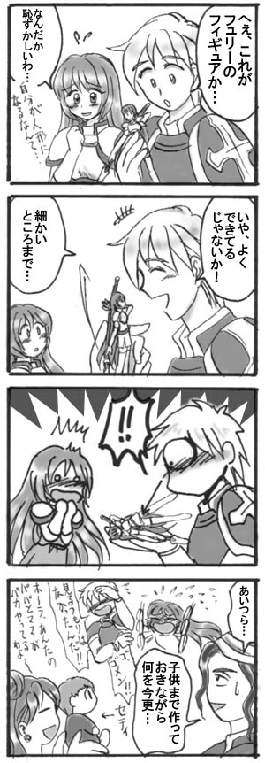 フュリーのフィギュア発売を祝うべく描きました! そしてしっかりノイッシュ×フュリーネタにしてしまいました(爆) …色々とすみません…。 でもホラ、フィギュアのスカートの中って、背徳感を覚えながらも 覗いてしまいませんか!?…わ、わたしだけ!?(汗) あ、このノイッシュは別に覗こうと思って覗いたわけではく、 色々な角度から見回していたらたまたま見てしまったんですよ(笑) ノイフュリよ、いつまでも初々しくあれ!(謎)