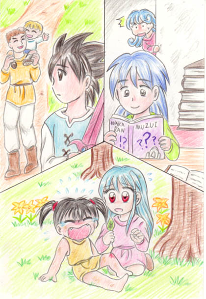 通りすがりの父子を羨ましげに見つめるアスル。父のいない寂しさを修行で 紛らわしていたところもあったのかもしれません。レオンは子供の頃から 難しい本も読みこなす神童でした。妹のレイチェもビックリ。エレナはまだ ホイミが使えない頃から、生傷の絶えないランの手当てをよくしていました。