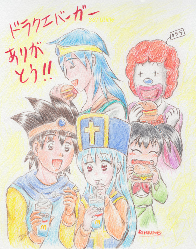 いつでもそこにマクDQナルド クルトは赤いアフロを装備しています(笑)(昔、DQ9とmがコラボした時に実際ゲーム中で手に入ったんですよね…) マックフィズ&マックフロートのスライムカップ可愛かったですね〜♪ ちなみに水彩色鉛筆で描きました。 戻る